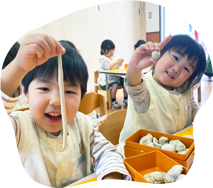 「健康・人間関係・環境・言葉・表現」の領域を基準にし、自由に遊んだりする過程で子ども達は、たくさんのことを学びます。さまざまな物にふれ合い、実際に体験することで、人間性や感受性を育てます。